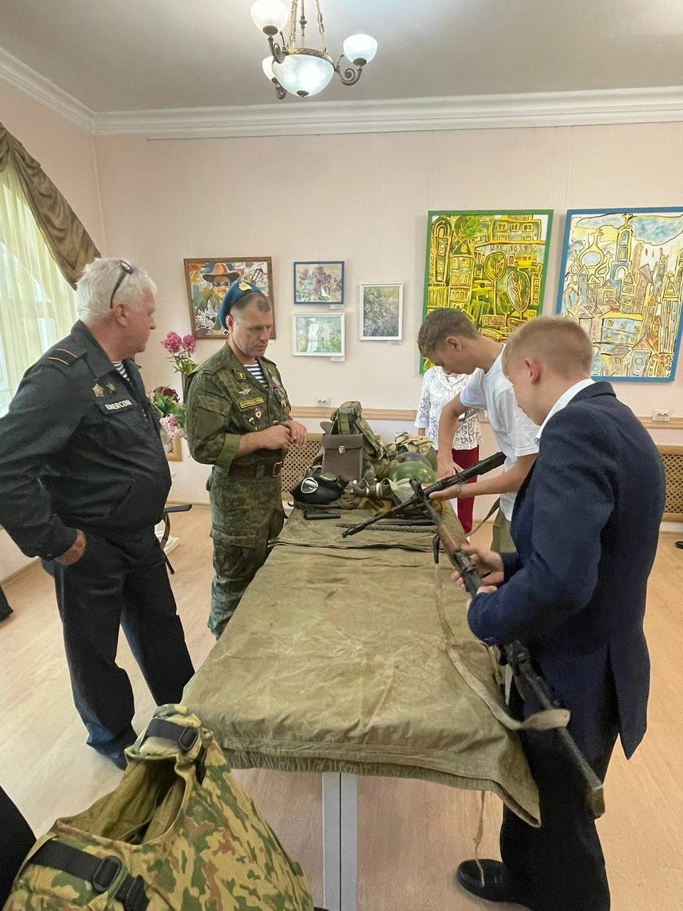 Ребятам рассказали и показали вооружение и снаряжение военнослужащих, а также им дали возможность померить и подержать в руках вооружение.