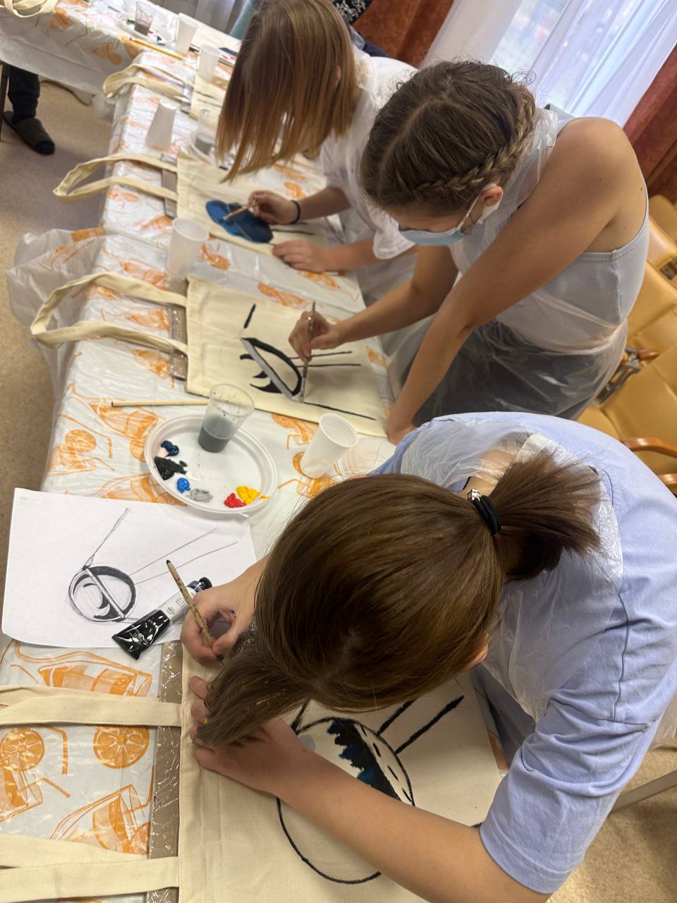 Вторая часть мероприятия посвящена арт-терапии и созданию рисунка на шоперах. Мастер-класс по росписи провела художник профессиональной студии «Арт Квартира» Корнилова Екатерина. Для сюжета был выбран один из символов освоения космоса - первый искусственный спутник земли.