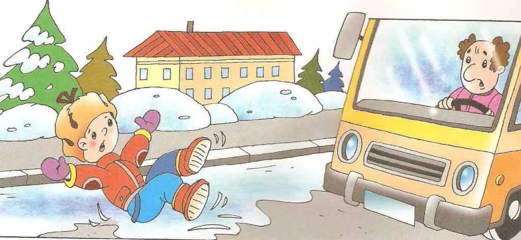 В гололёд: после тёплых дней наступило похолодание. Дорога покрылась ледяной коркой, стало скользко. В этих условиях появляться перед близко идущим транспортом очень опасно: на скользкой дороге машину остановить трудно. Поэтому по пути домой будьте особенно осторожны. Не спешите, т. к. можно неожиданно упасть и оказаться под колёсами.