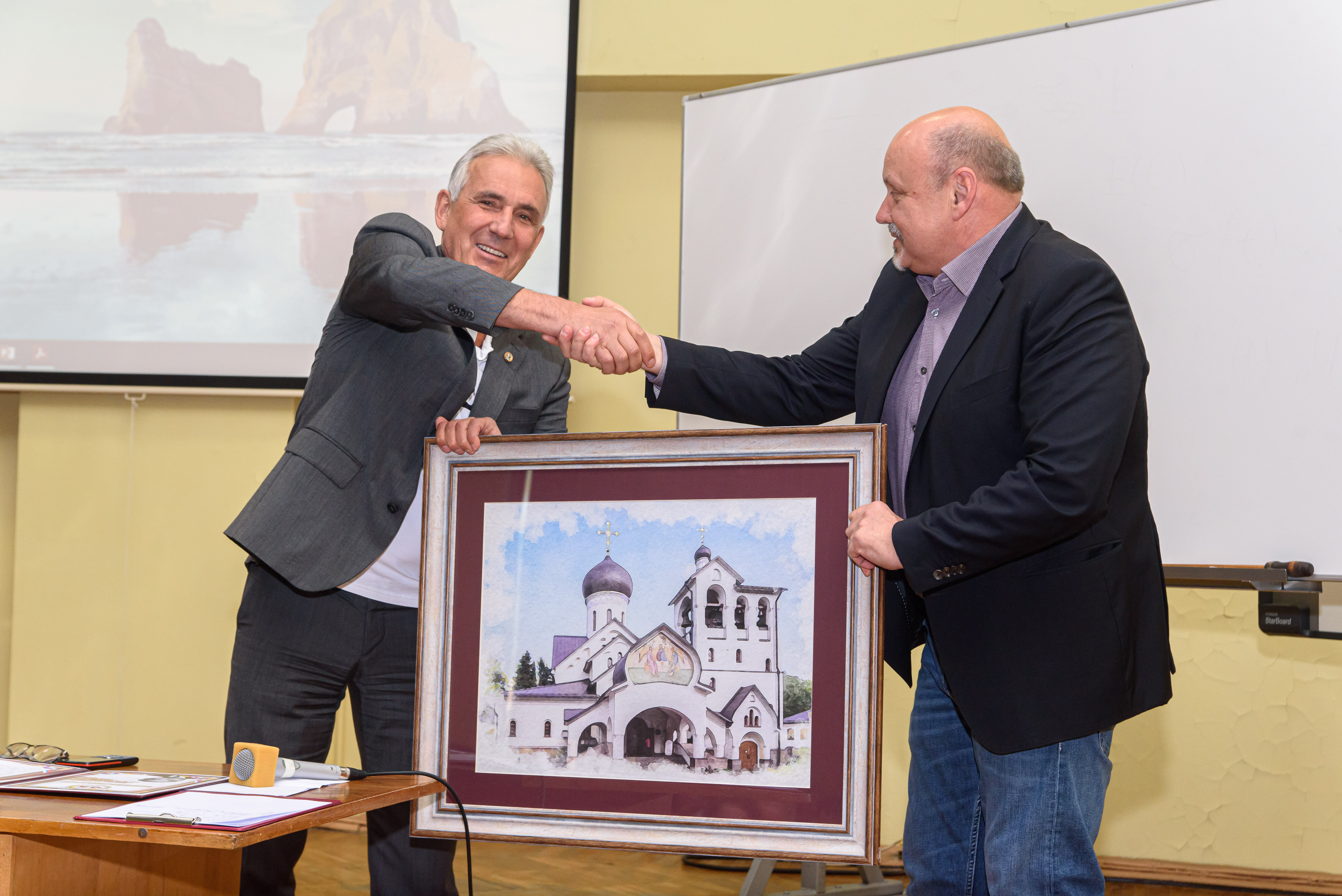 Глава города вручает Вадиму Бражкину подарок – картину с изображением Церкви Живоначальной Троицы работы Юрия Пекуровского. А до неформальной части ещё далеко: впереди, как назвал это директор, «стандартный смотр сил» – научные доклады. И уже потом речи и воспоминания, теперь уже за праздничным столом.