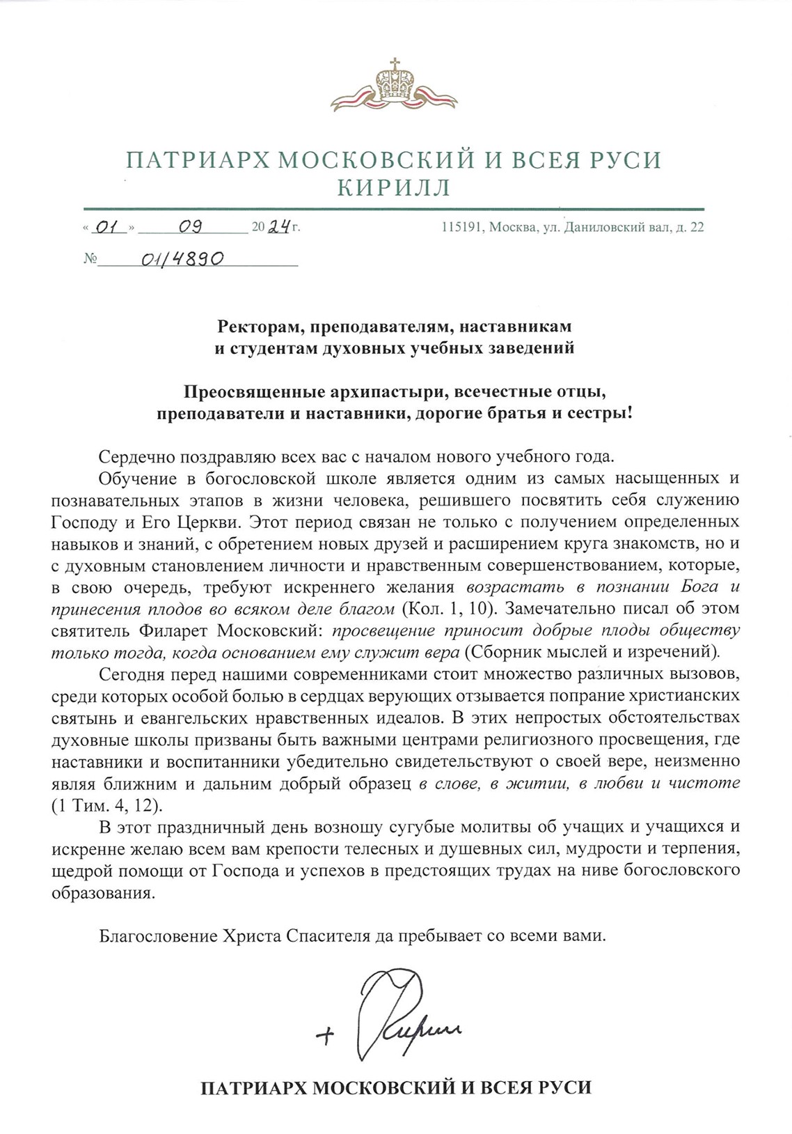 В преддверии нового, 2024/2025 учебного года Святейший Патриарх Московский и всея Руси Кирилл поздравил ректоров, преподавателей и студентов духовных учебных заведений Русской Православной Церкви.